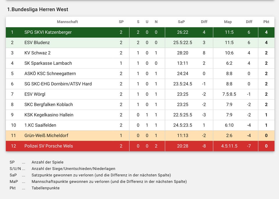 dabei aber als erster Stolperstein. Im ersten Durchgang gab es gleich einen Kegel-Leckerbissen zu sehen. Kohl Bernhard ließ seinem Gegner, Ecker Daniel, mit fantastischen 641 zu 550 keine Chance und brachte mit seinen Neuner Serien das Heimpublikum zum Jubeln. Weniger zum Jubeln hatte Schwarz Markus an diesem Tag. Nach starkem Anfang verlor er den Faden und hatte gegen Kaiblinger Gabriel mit 524 zu 590 das Nachsehen. Nach dem ersten Durchgang war es noch ein ausgeglichenes Spiel, ehe die Katzenberger dieses an sich rissen. Neuzugang Fasching Walter zeigte erstmals sein Können und holte mit 601 den Punkt gegen 554 von Benjamin Bauer. Parallel dazu ließ sich Albrich Roland, trotz zahlreicher Patzer, nicht aus der Ruhe bringen. Nach verlorenem 1. Satz drehte er das Spiel und punktete mit 583 zu 553 gegen Futschek Thomas. In Wels schon überragend, zeigte Flörl Peter auch zuhause eine starke Leistung. 625 standen nach 120 Wurf auf der Anzeige und nahm damit dem Micheldorfer Bruckner Klaus (555) 70 Kegel und den Mannschaftspunkt ab. Kapitän Eller Markus erwischte mit 518 einen Tag zum Vergessen, der verlorene Punkt gegen die 575 von Cozik Tomas änderte aber nichts mehr am Sieg der Katzenberger. Endstand 6:2 mit 582 zu 562 Schnitt. (Albrich Roland)