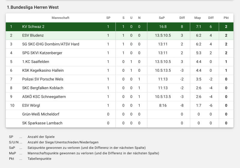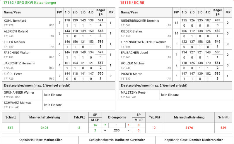 dabei aber als erster Stolperstein. Im ersten Durchgang gab es gleich einen Kegel-Leckerbissen zu sehen. Kohl Bernhard ließ seinem Gegner, Ecker Daniel, mit fantastischen 641 zu 550 keine Chance und brachte mit seinen Neuner Serien das Heimpublikum zum Jubeln. Weniger zum Jubeln hatte Schwarz Markus an diesem Tag. Nach starkem Anfang verlor er den Faden und hatte gegen Kaiblinger Gabriel mit 524 zu 590 das Nachsehen. Nach dem ersten Durchgang war es noch ein ausgeglichenes Spiel, ehe die Katzenberger dieses an sich rissen. Neuzugang Fasching Walter zeigte erstmals sein Können und holte mit 601 den Punkt gegen 554 von Benjamin Bauer. Parallel dazu ließ sich Albrich Roland, trotz zahlreicher Patzer, nicht aus der Ruhe bringen. Nach verlorenem 1. Satz drehte er das Spiel und punktete mit 583 zu 553 gegen Futschek Thomas. In Wels schon überragend, zeigte Flörl Peter auch zuhause eine starke Leistung. 625 standen nach 120 Wurf auf der Anzeige und nahm damit dem Micheldorfer Bruckner Klaus (555) 70 Kegel und den Mannschaftspunkt ab. Kapitän Eller Markus erwischte mit 518 einen Tag zum Vergessen, der verlorene Punkt gegen die 575 von Cozik Tomas änderte aber nichts mehr am Sieg der Katzenberger. Endstand 6:2 mit 582 zu 562 Schnitt. (Albrich Roland)