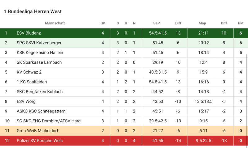 Am vergangenen Samstag war der Esv Bludenz beim Tabellenführer, Spg Skvi 1937 Kc Katzenberger, zu Gast. Der 8:0 Sieg gegen Kv Schwaz 2 wurde ordentlich gefeiert und so konnte man sich im Training auf die neue Aufgabe vorbereiten. Die Vorarlberger, die auf den verletzen Gruber Mario verzichten mussten, erwiesen sich anfangs allerdings als hartnäckig und so geriet man nach 60 Wurf auch mal kurzfristig in Rückstand. Kohl Bernhard war mit 175 auf der Startbahn der Überflieger des ersten Satzes, konnte aber an diese Leistung nicht mehr anschließen, die erspielten 570 waren für den Bludenzer Kaufmann Manuel (516) allerdings stets außer Reichweite. Teamkollege Schwarz Markus hatte an diesem Tag die Mitte für sich gepachtet. Von dieser kam er einfach nicht weg und so versuchte Kapitän Eller Markus ab dem 61 Wurf sein Glück. Mit 151 auf der Schlussbahn konnte er zwar noch ein paar Kegel aufholen, sein holpriger Start verhinderte aber mehr und so holte sich Wiegele Helmut mit 540 zu 518 den ersten Punkt für die Mannen aus dem Ländle. Im 2. Durchgang erreichte die Stimmung, die an diesem Spieltag von beiden Vereinen aus fantastisch war, ihren Höhepunkt. Vereinsmeister Fasching Walter konnte seine starken Trainingsleistungen endlich im Wettkampf wiedergeben und knallte 631 auf die Bahn. Damit nahm er seinem Gegner, Zimmermann Johann (529), nicht nur den Punkt, sondern auch gleich spielentscheidende 102 Kegel ab. Weniger dominant war es bei Jakschitz Hermann gegen Berkmann Jürgen, jedoch konnte er mit 552 zu 550 das Punktekonto der Katzenberger weiter anfüttern. Im dritten Durchgang unterstrich Albrich Roland seine schlechten Trainingsleistungen mit einem noch schlechteren Spiel (547) und konnte Hammerl Stefan, den Tagesbesten der Bludenzer, zu seinen 590 nur noch gratulieren. Zu Flörl Peter hieß es nach verpatztem Start nach 60 Wurf "jetzt kommen die guten Bahnen" und so war es dann auch. Mit 307 in Satz 3 und 4 erspielte er noch 572 und sorgte so für den letzten Punkt gegen Tratinek Siegfried und dessen 490. Ergebnis 6:2 mit 565 zu 535 Schnitt. Am 19.10. 14:00 Uhr kommen schon die nächsten Vorarlberger nach Innsbruck. Die Spielgemeinschaft Dornbirn/Hard wird als Außenseiter sicher alles dafür tun, um dem Abstiegskampf zu entkommen, die Innsbrucker werden sich aber zu wehren wissen. (Albrich Roland)