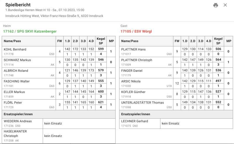 Flörl Peter gelang hingegen ein Meisterstück. Mit fantastischen 628 nahm er Plaha Roland 101 Kegel und den Mannschaftspunkt ab. Mit Neuzugang Fasching Walter und Routiner Jakschitz Hermann hatten die Innsbrucker noch 2 heiße Eisen parat. Fasching holte mit 543 zu 491 seinen ersten Punkt für den neuen Verein. Auf der anderen Bahn überzeugte Jakschitz mit 578, blieb aber gegen Wollanek Edi mit 614 punktelos. 3:5 und 559 zu 572 Schnitt stand am Ende auf der Anzeige zugunsten der Katzenberger. Nächste Woche, 16.9. ab 15.00, kommt gleich das nächste schwere Spiel auf die Truppe rund um Eller Markus zu. Grün-Weiß Micheldorf ist zu Gast auf Hötting-West. (Albrich Roland)