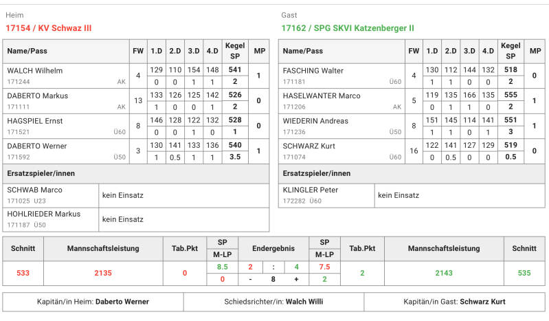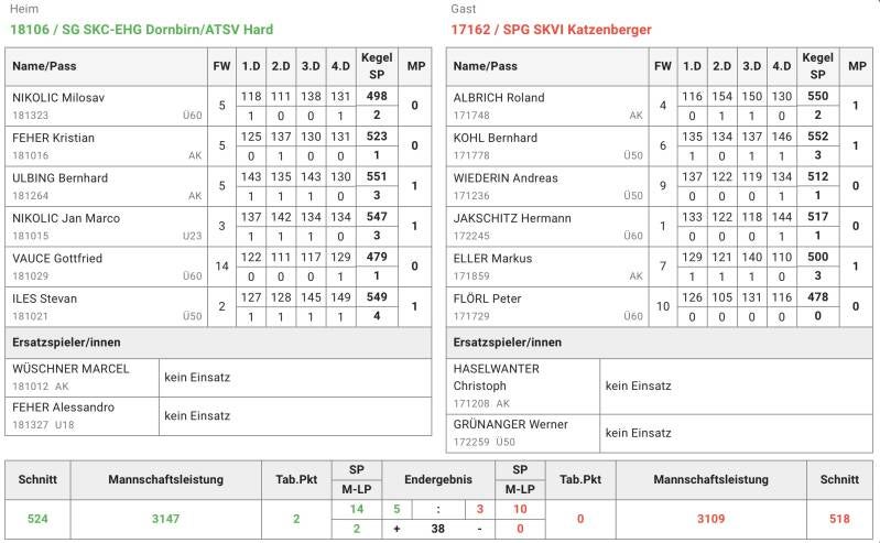"Da verliert man 7:1 aber im Auto ist eine Stimmung, als hätte man 8:0 gewonnen", merkte Fasching Walter bei der Rückfahrt von Schwarzach nach Innsbruck an. Wie an diesem Zitat schon ersichtlich, gab es in der dritten Runde für die Spg Skvi 1937 Kc Katzenberger gegen den Ksk Hallein nichts zu holen. Die zwangsweise nach Schwarzach übersiedelten Halleiner gingen dabei schon im ersten Durchgang 2:0 und ~60 Kegel in Führung. Eller Markus, der sich sein Comeback nach Verletzung sicher anders vorgestellt hat, verlor mit 513 gegen den Tagesbesten der Halleiner, Friedrich Christian (575). Kohl Bernhard, der zum 4. Mal in Folge Bester der Katzenberger war, verlor seinen Punkt ebenso, allerdings denkbar knapp mit 560 gegen die 559 von Erlbacher Martin. Dieser hatte zwar 1 Kegel weniger, die 2.5 Satzpunkte ließen ihn aber am Ende die Hände in die Höhe reißen. Ein Rückstand nach dem ersten Durchgang ist kein Beinbruch, allerdings missglückte die Aufholjagt von Schwarz Markus und Albrich Roland komplett. Schwarz Markus konnte 60 Wurf mit Lienbacher Michael gut mithalten, die 113 vom dritten Satz konnte er am Ende aber nicht mehr aufholen und verlor mit 539 zu 551. Albrich geriet gegen Schulz Markus nach 60 Wurf ins Hintertreffen, die Aufholjagt blieb allerdings unbelohnt, denn mit einem dummen Fehlwurf im vorletzten Wurf, verschenkte er den Punkt mit 561 zu 559 an den Halleiner. Mit 4:0 Rückstand konnte man das Spiel nicht mehr gewinnen, allerdings probierten die Innsbrucker lautstark die Spieler des Schlussdurchgangs anzufeuern um zumindest ein Unentschieden zu retten. Vergeblich. Fasching Walter holte mit 544 zu 515 gegen Kirchberger Roland den Ehrenpunkt, Flörl Peter hingegen zog mit 552 gegen die 556 von Gneist Holger den kürzeren und so verlor man 7:1 mit 552 zu 544 Schnitt. Nächsten Samstag ab 14 Uhr steigt das Derby gegen Kv Schwaz. Die Stimmung letztes Jahr war fantastisch und so lohnt sich auch heuer sicher wieder ein Besuch dieses Spiels. (Albrich Roland)
