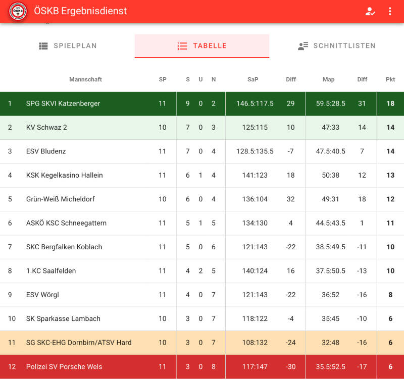 Unsere Bundesliga Herren gastierten am Samstag in Schneegattern. Auf der schwer zu spielenden Bahn mussten sich unsere Herren klar mit 7:1 geschlagen geben. Im ersten Durchgang verloren Markus (529) und Bernhard (542) bereits beide Punkte und 72 Kegel. Im Mitteldurchgang konnten Roland (540) und Walter (497) sogar einen kurzfristigen Kegelvorsprung erspielen, mussten jedoch schlußendlich beide Punkte den Gegnern überlassen. Somit startete man mit einem 0:4 und -70 Kegel in den letzten Durchgang. Nun lag es an Peter (540) und Hermann (567) das Ding noch zu drehen, jedoch gegen die stark spielenden Schlussstarter von Schneegattern war nur der Ehrenpunkt durch Hermann zu retten. Unser direkter Verfolger KV Schwaz konnte diesen Ausrutscher jedoch nicht ausnützen und verlor ebenfalls 7:1 in Saalfelden, somit bleiben unsere Herren weiter mit 4 Punkten Vorsprung an der Tabellenspitze. Am Samstag geht es dann mit dem Heimspiel gegen die SG SKC-EHG Dornbirn/ATSV Hard weiter.